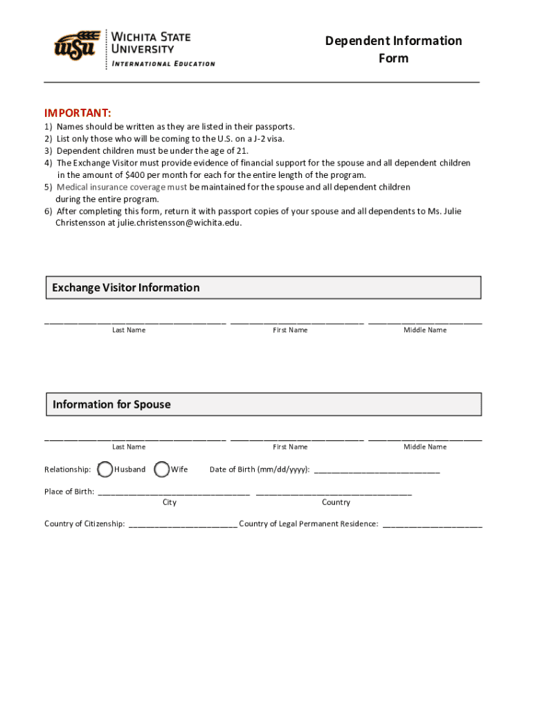 DependentInformation FormIMPORTANT: 1)Namesshouldbewrittenastheyarelistedintheirpassports. 2)ListonlythosewhowillbecomingtotheU. S.onaJ2visa. 3)Dependentchildrenmustbeundertheageof21. 4)TheExchangeVisitormustprovide