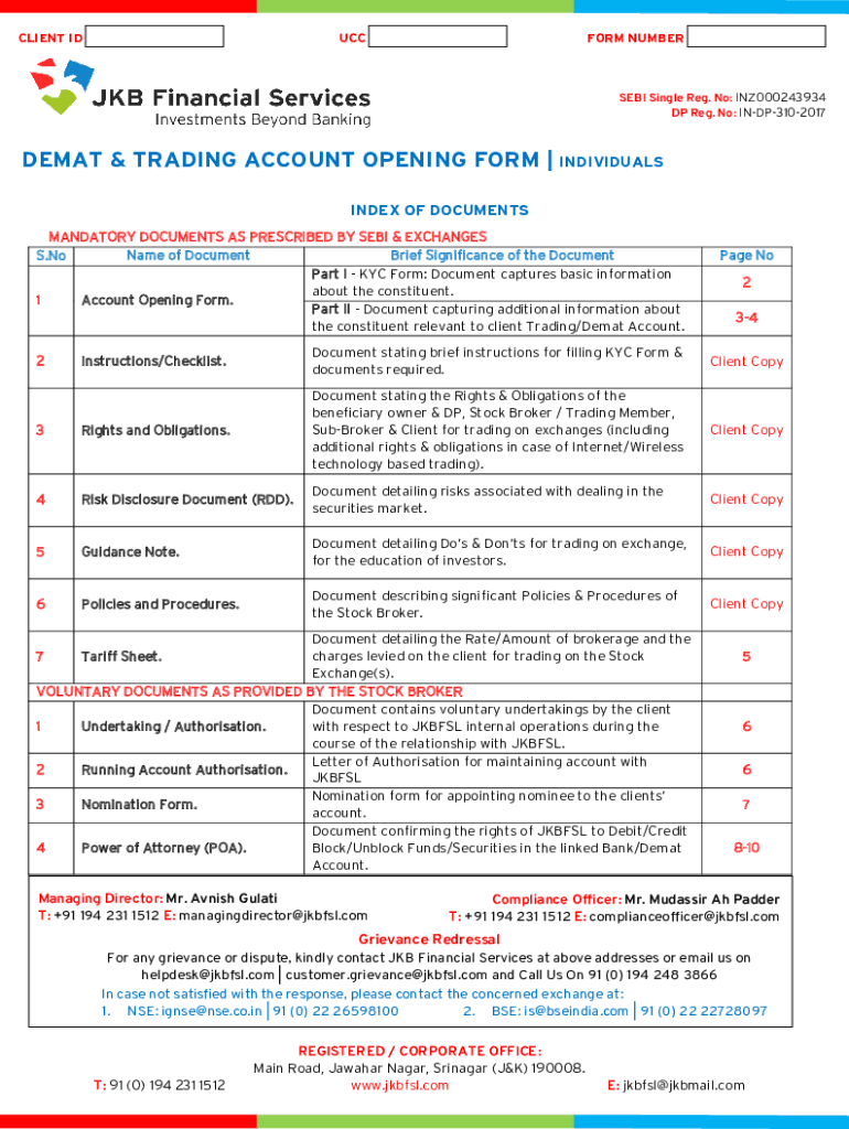 CLIENT CRUCIFORM NUMBERS EBI Single Reg. No: INZ000243934 DP Reg. No: INDP3102017DEMAT & TRADING ACCOUNT OPENING FORM | INDIVIDUALS INDEX OF DOCUMENTS MANDATORY DOCUMENTS AS PRESCRIBED BY SEMI & EXCHANGES