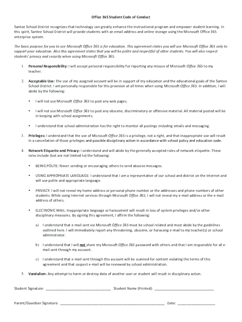 Office365StudentCodeofConduct SanteeSchoolDistrictrecognizesthattechnologycangreatlyenhancetheinstructionalprogramandempowerstudentlearning. In this spirit,SanteeSchoolDistrictwillprovidestudentswithanemailaddressandonlinestorageusingtheMicrosoftOffice365