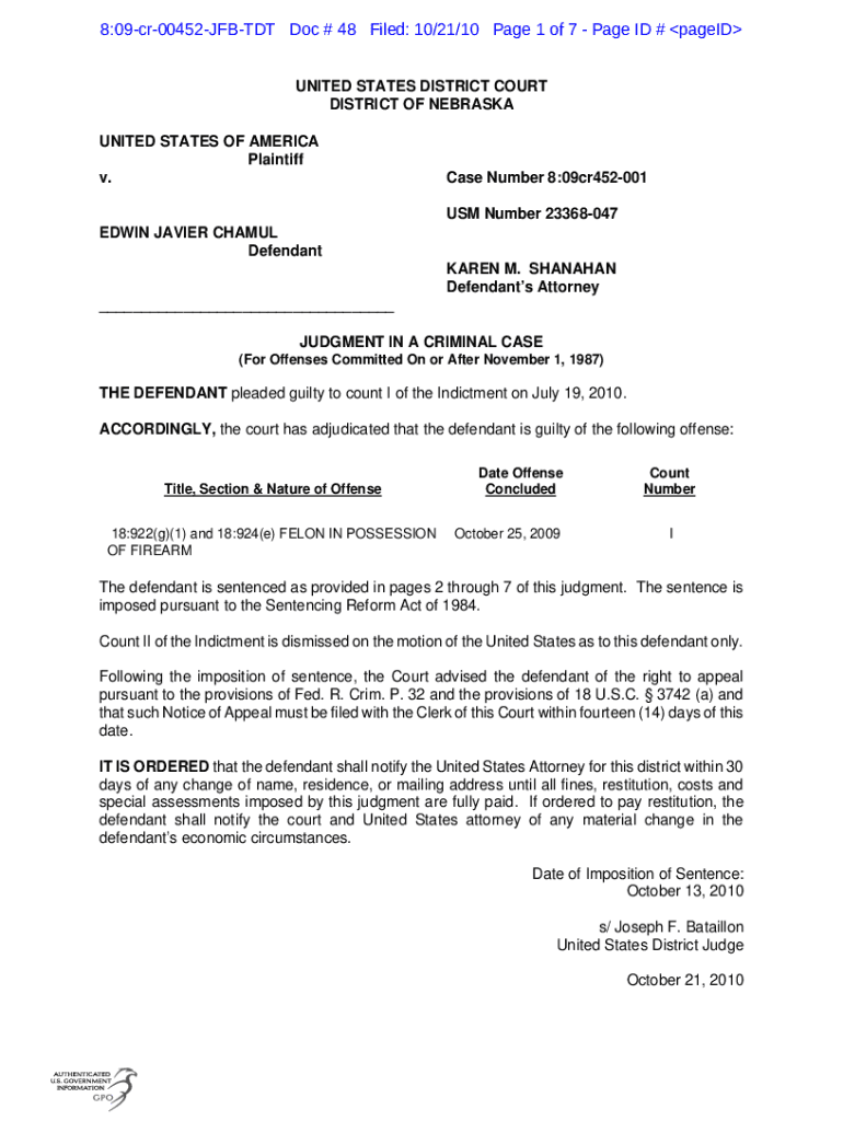 8:09cr00452JFBTDT Doc # 48 Filed: 10/21/10-Page 1 of 7-Page ID # paged UNITED STATES DISTRICT COURT DISTRICT OF NEBRASKA UNITED STATES OF AMERICA Plaintiff v. Case Number 8:09cr452001 US Number 23368047EDWIN