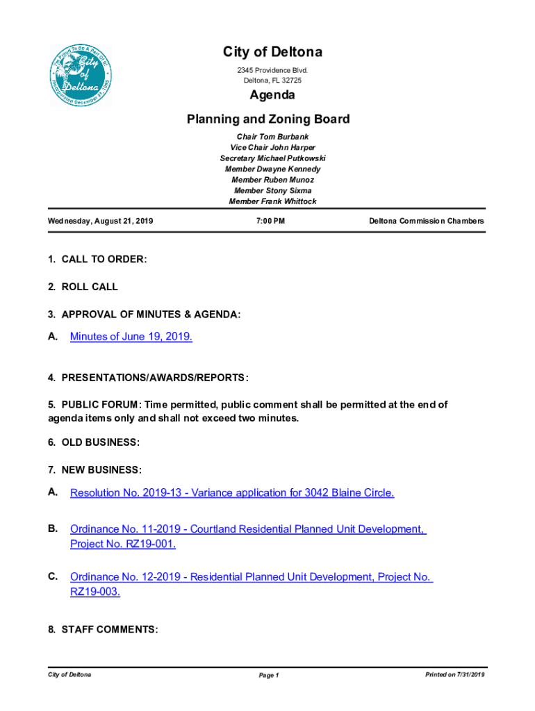 City of Deltona 2345 Providence Blvd. Deltona, FL 32725Agenda Planning and Zoning Board Chair Tom Burbank Vice Chair John Harper Secretary Michael Murkowski Member Dwayne Kennedy Member Ruben Munoz