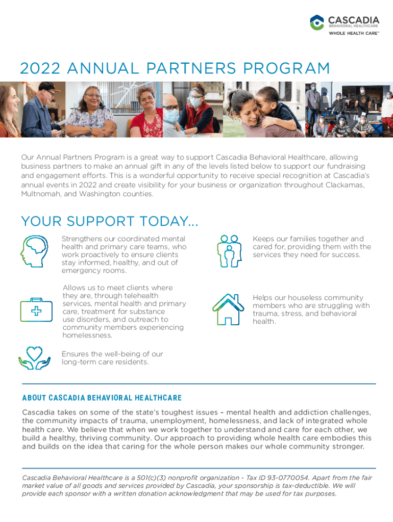 2022 ANNUAL PARTNERS Programmer Annual Partners Program is a great way to support Cascadia Behavioral Healthcare, allowing business partners to make an annual gift in any of the levels listed below