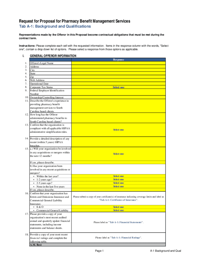 Request for Proposal for Pharmacy Benefit Management Services Tab A1: Background and Qualifications Representations made by the Offer or in this Proposal become contractual obligations that must be