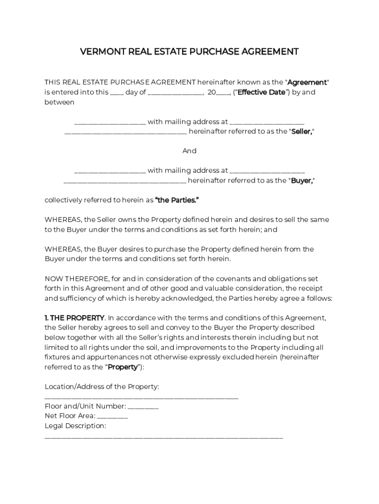 VERMONT REAL ESTATE PURCHASE AGREEMENT THIS REAL ESTATE PURCHASE AGREEMENT hereinafter known as the \” Agreement\” is entered into this ___ day of ___, 20___, (Effective Date) by and between ___