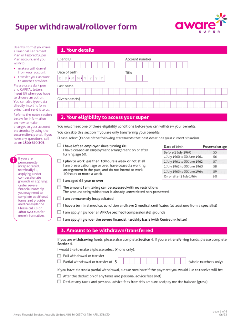 Edit your awarecomauadvicesp-super-withdrawal-formsuper withdrawalrollover form form online