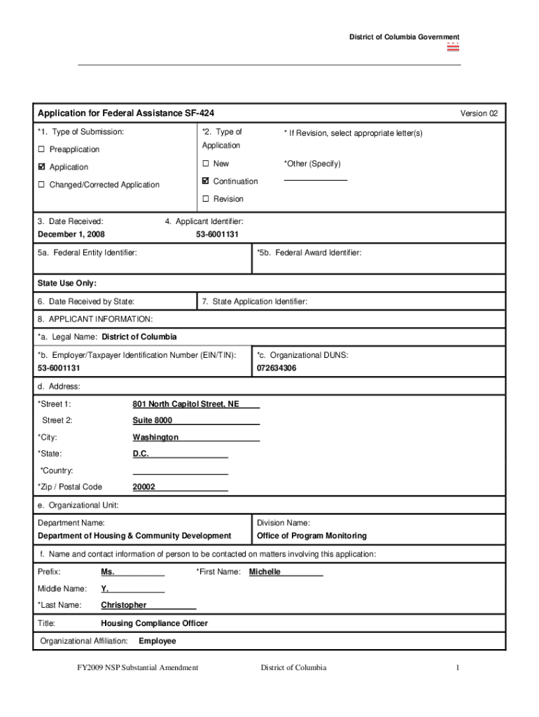 Get the free Application Form SF424.pdf - DOEE.DC.Gov. - dhcd dc