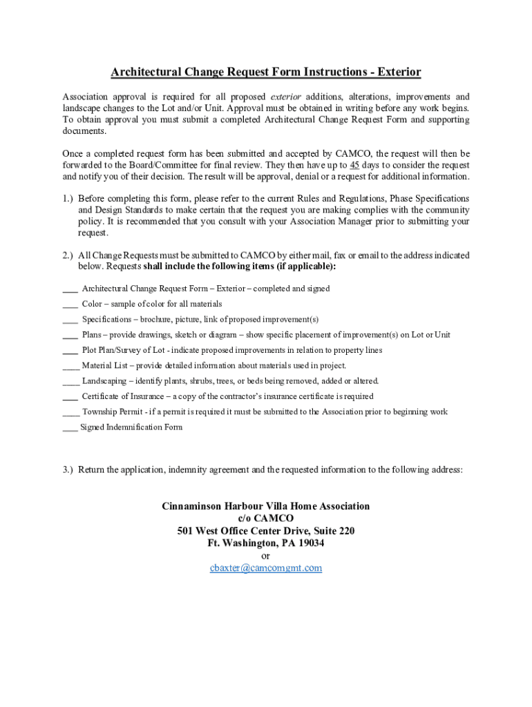 Architectural Change Request Form Instructions Exterior Association approval is required for all proposed exterior additions, alterations, improvements and landscape changes to the Lot and/or Unit.