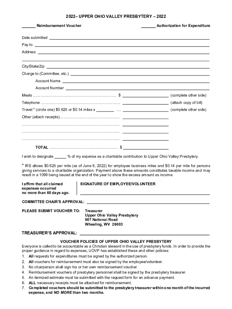 2022 UPPER OHIO VALLEY PRESBYTERY 2022 Reimbursement VoucherAuthorization for ExpenditureDate submitted Pay to Addressing/State/Zip Charge to (Committee, etc.) Account Name Account Number Meals $(complete