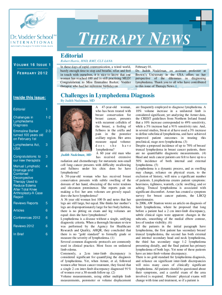 THERAPY NEWS Editorial Robert Harris, HND, RAT, CLTLANAV VOLUME 1 6 ISSUE 1 F E B R U AR Y 2 0 1 2Inside this issue: Editorial1Challenges in Lymphedema Diagnosis12Emmaline Barker 23 turned 100 years
