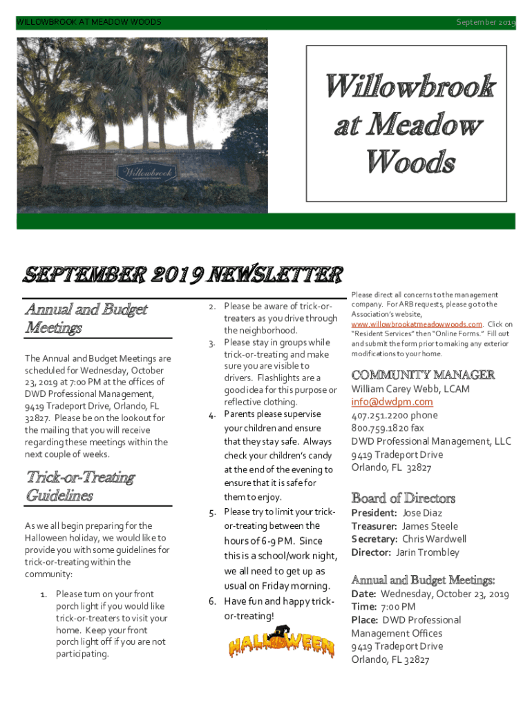 WILLOWBROOK AT MEADOW WOODS September 2019Willowbrook at Meadow Woods September 2019 Newsletter Annual and Budget Meetings The Annual and Budget Meetings are scheduled for Wednesday, October 23, 2019,