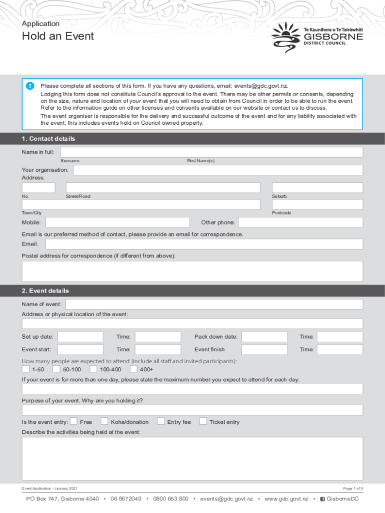 ApplicationHold an Eventless complete all sections of this form. If you have any questions, email: events@gdc.govt.nz. Lodging this form does not constitute Councils approval to the event. There may