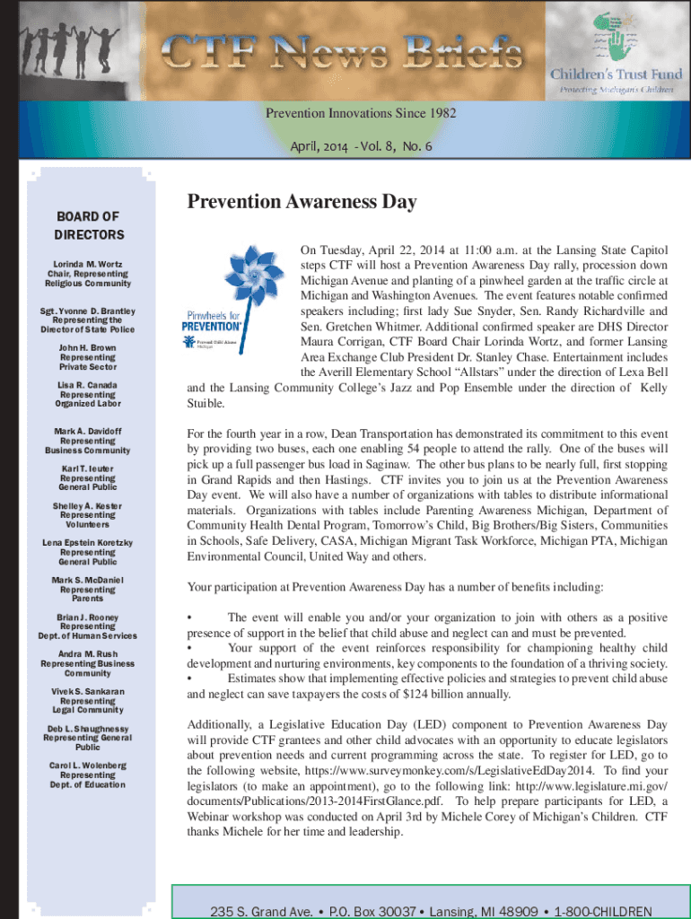Prevention Innovations Since 1982 April 2014 June 2009 Vol. Vol.8,3 No. No.69BOARD OF DIRECTORS Dorinda M. Worth Chair, Representing Religious Community Sgt. Yvonne D. Brantley Representing the Director