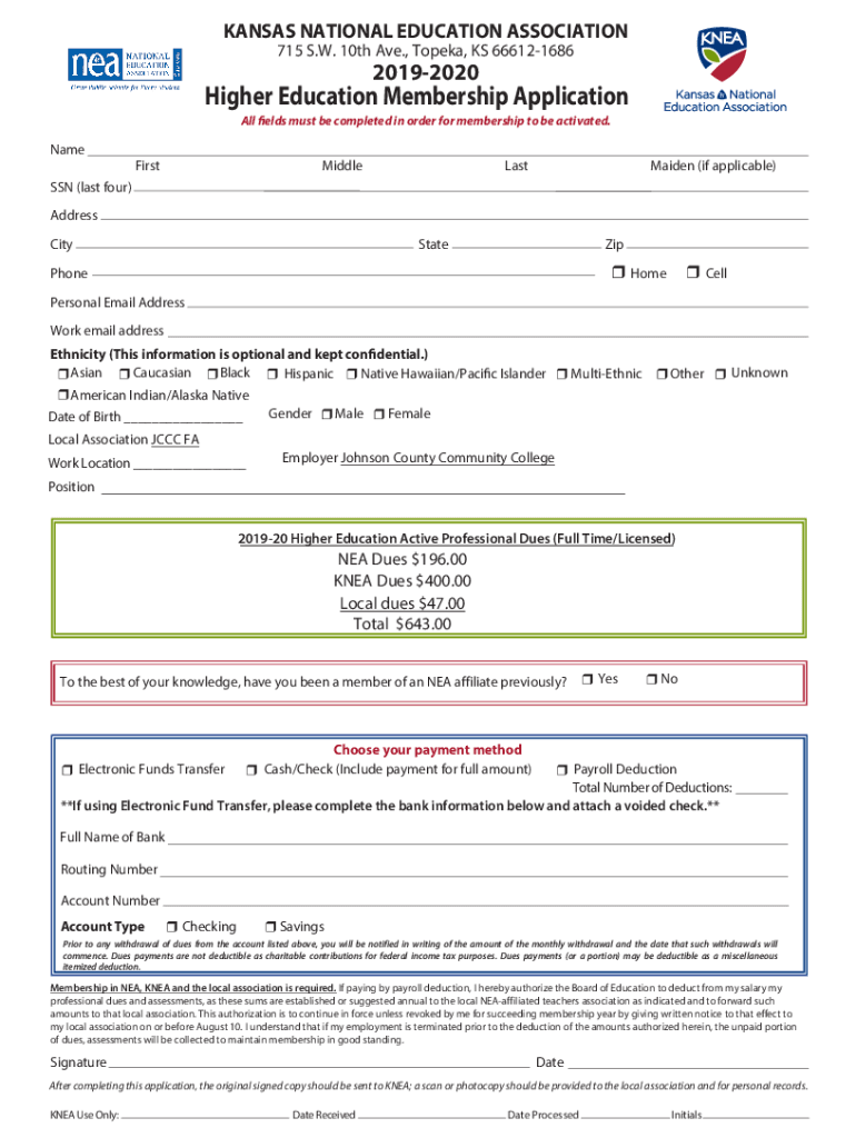 KANSAS NATIONAL EDUCATION ASSOCIATION 715 S.W. 10th Ave., Topeka, KS 66612168620192020Higher Education Membership Application All fields must be completed in order for membership to be activated.