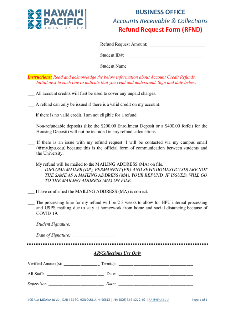 BUSINESS OFFICE Accounts Receivable & Collections Refund Request Form (RFID) Refund Request Amount: ___ Student ID#: ___ Student Name: ___ Instructions: Read and acknowledge the below information