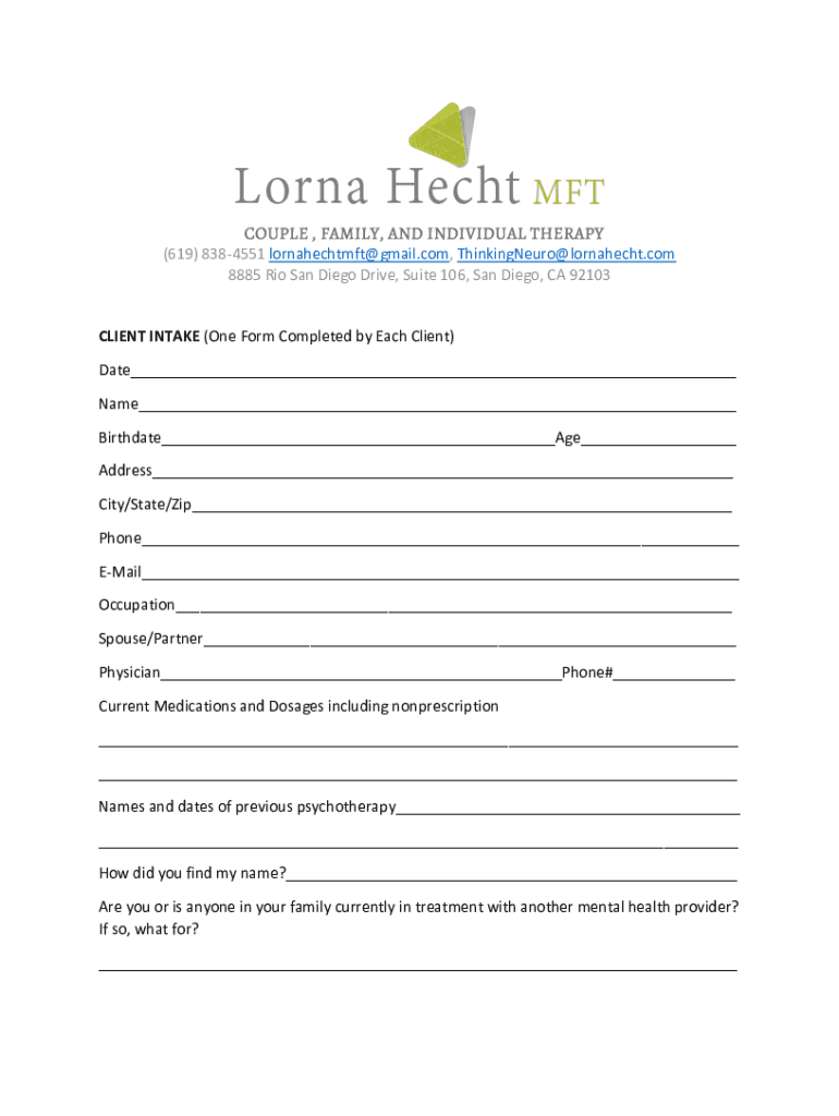 (619) 8384551 lornahechtmft@gmail.com, ThinkingNeuro@lornahecht.com 8885 Rio San Diego Drive, Suite 106, San Diego, CA 92103CLIENT INTAKE (One Form Completed by Each Client) Date___ Name___ Birthdate___Age___