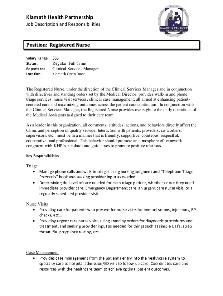 Namath Health Partnership Job Description and ResponsibilitiesPosition: Registered Nurse Salary Range: Status: Reports to: Location:regular, Full Time Clinical Services Manager Namath Open Dorothy