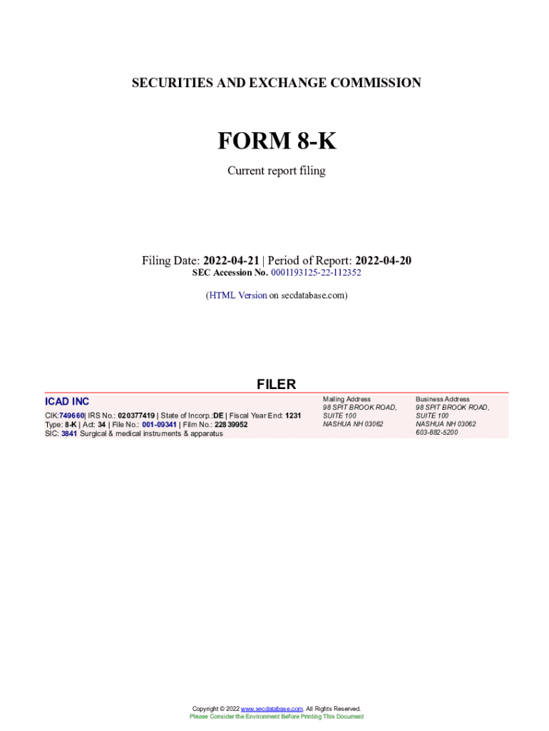 Get the free ICAD INC Form 8-K Current Event Report Filed 2022-04-21. Accession Number