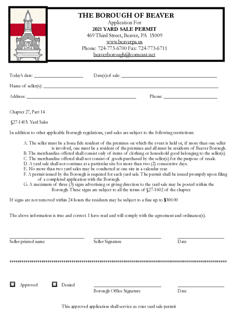 THE BOROUGH OF BEAVER Application For 2021 YARD SALE PERMIT 469 Third Street, Beaver, PA 15009 www.beaverpa.us Phone: 7247736700 Fax: 7247736711 beaverborough@comcast.netTodays date: ___Date(s)of