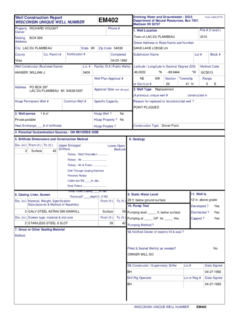 Get the free dnr.wi.gov WellConstructionSearch ReportViewerWell Construction Report BQ402 WISCONS...