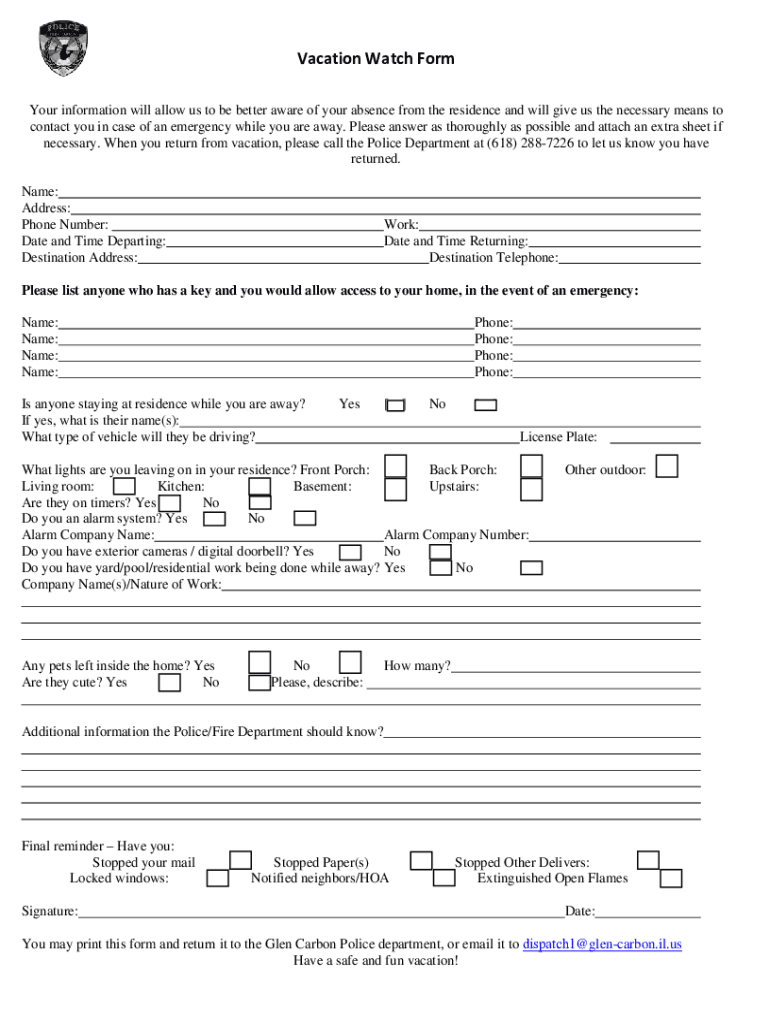 Vacation Watch Form Your information will allow us to be better aware of your absence from the residence and will give us the necessary means to contact you in case of an emergency while you are away.