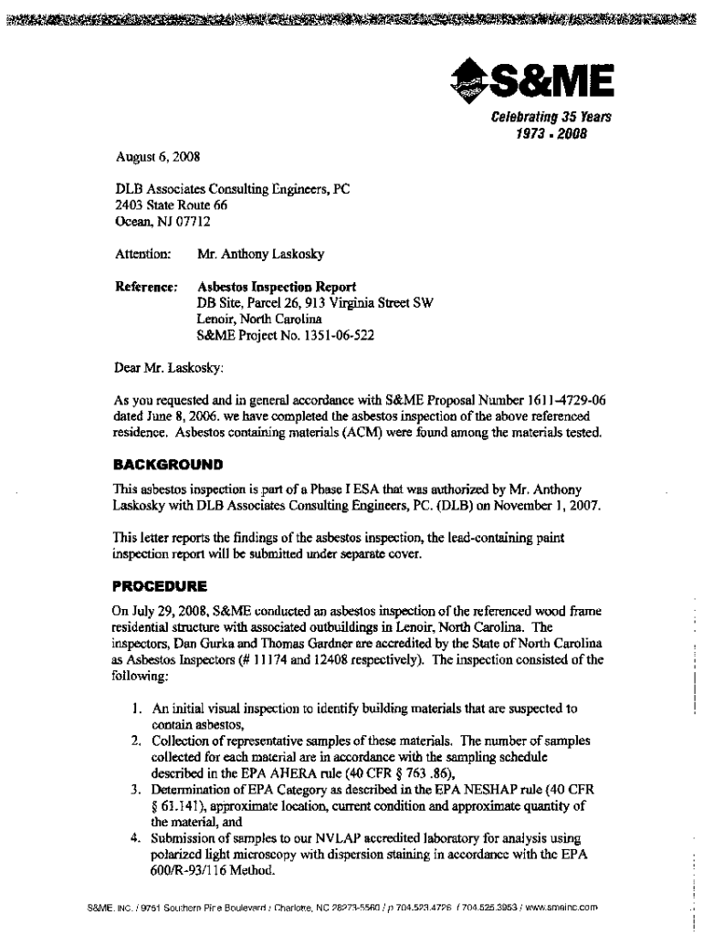 Celebrating 35 Years 1973. 2008 August 6, 2008, LB Associates Consulting Engineers, PC 2403 State Route 66 Ocean, NJ 07712 Attention:Reference:Mr. Anthony LaskoskyAsbestos Inspection Report DB Site,