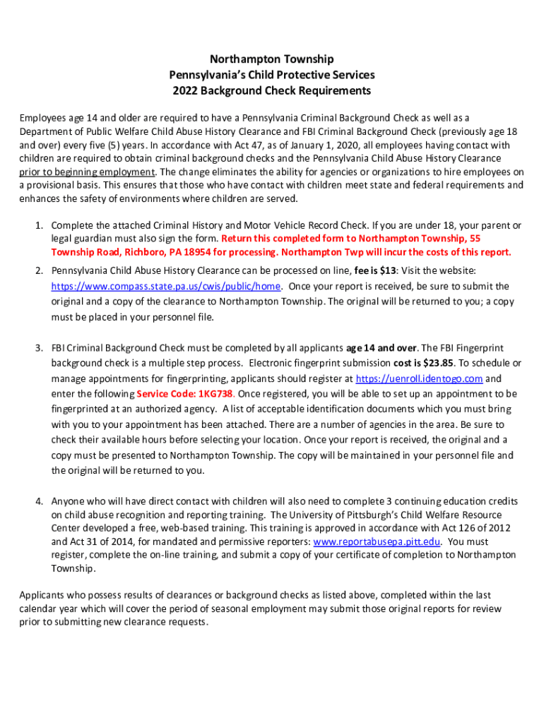 Northampton Township Pennsylvania's Child Protective Services 2022 Background Check Requirements Employees age 14 and older are required to have a Pennsylvania Criminal Background Check as well as