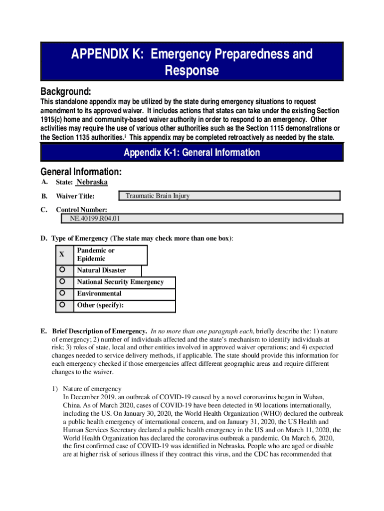 APPENDIX K: Emergency Preparedness and Response Background:This standalone appendix may be utilized by the state during emergency situations to request amendment to its approved waiver. It includes