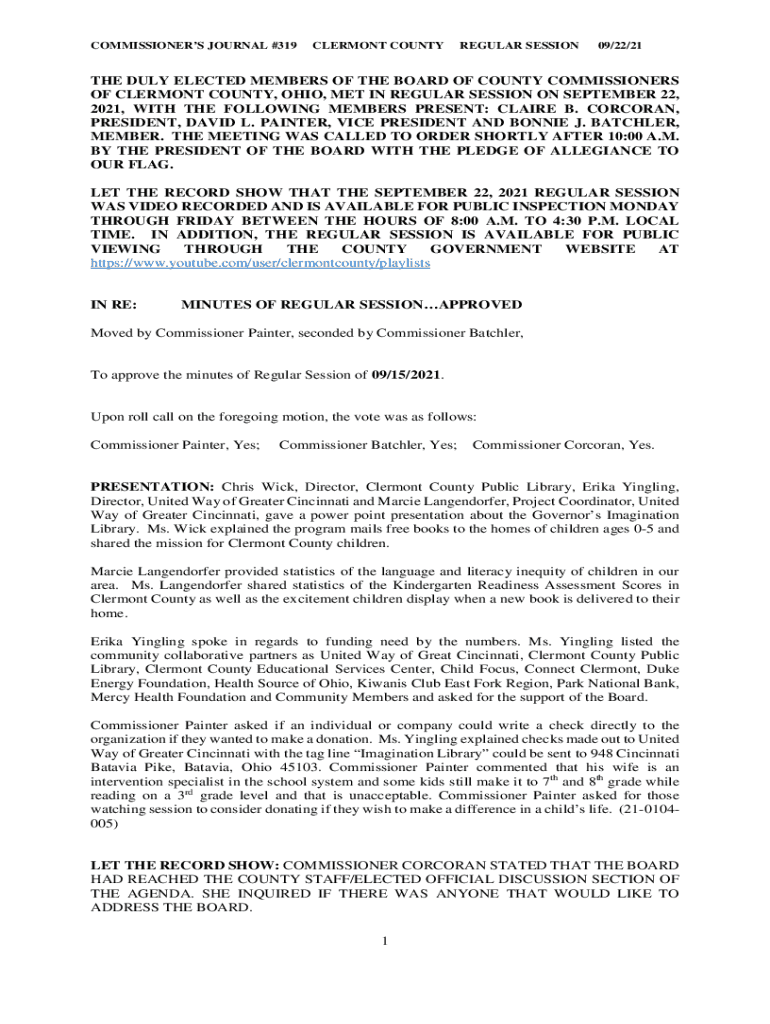 COMMISSIONERS JOURNAL #319CLERMONT COUNTYREGULAR SESSION09/22/21THE DULY ELECTED MEMBERS OF THE BOARD OF COUNTY COMMISSIONERS OF CLERMONT COUNTY, OHIO, MET IN REGULAR SESSION ON SEPTEMBER 22, 2021,