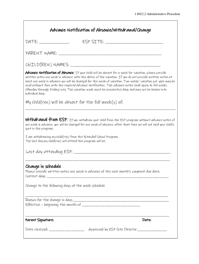 1.8012.2 Administrative ProcedureAdvance Notification of Absence/Withdrawal/Change DATE: ___ESP SITE: ___PARENT NAME: ___ CHILD(MEN) NAMES: ___ Advance Notification of Absence: If your child will