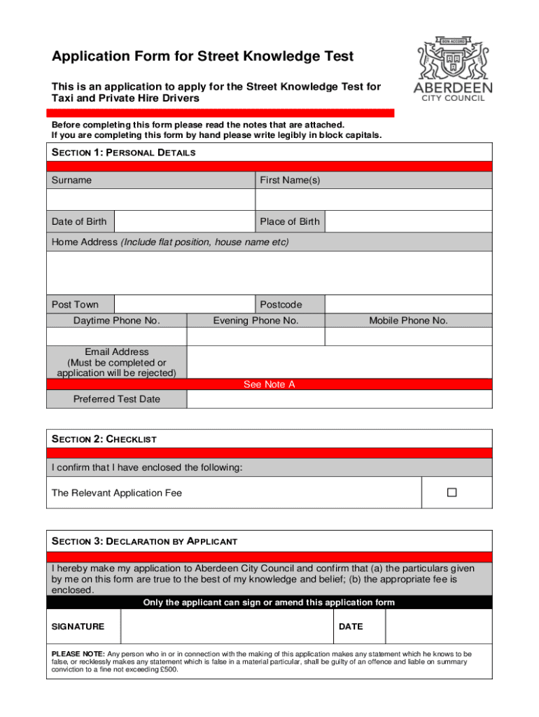 Application Form for Street Knowledge Test This is an application to apply for the Street Knowledge Test for Taxi and Private Hire Drivers Before completing this form please read the notes that are