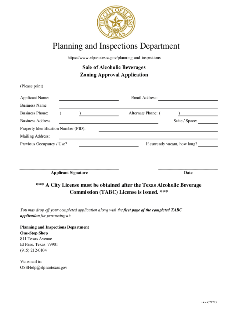 Planning and Inspections Department https://www.elpasotexas.gov/planningandinspectionsSale of Alcoholic Beverages Zoning Approval Application (Please print) Applicant Name:Email Address:Business Name: