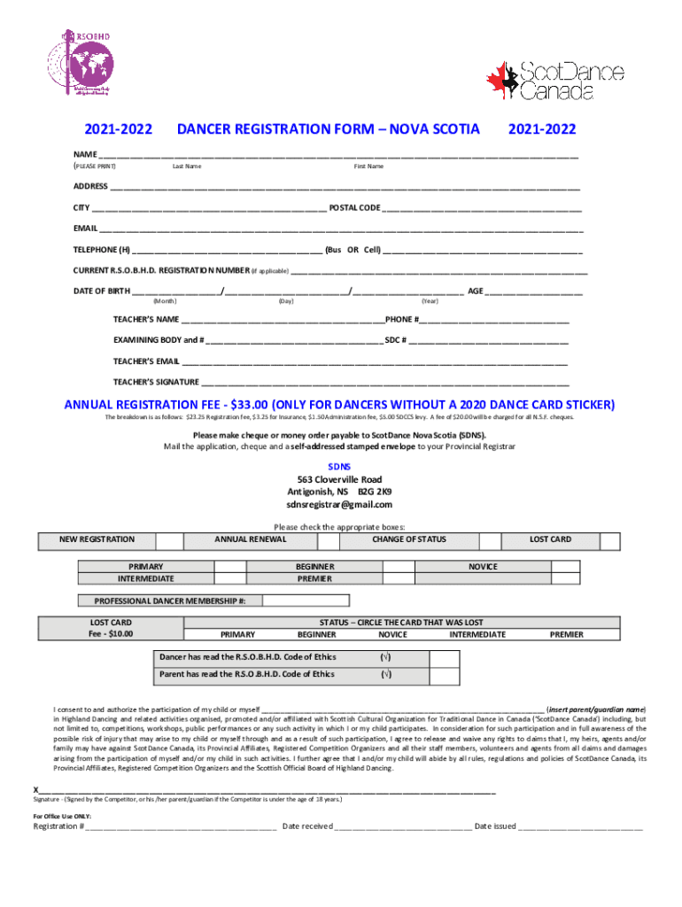 20212022DANCERREGISTRATIONFORMNOVASCOTIA20212022 NAME___ (GREASEPAINT) Hostname Filename ADDRESS___ CITY___POSTALCODE___ EMAIL___ TELEPHONE(H)___(Purcell)___ CURRENT. S.O.B.H.D.REGISTRATIONNUMBER(inapplicable)___