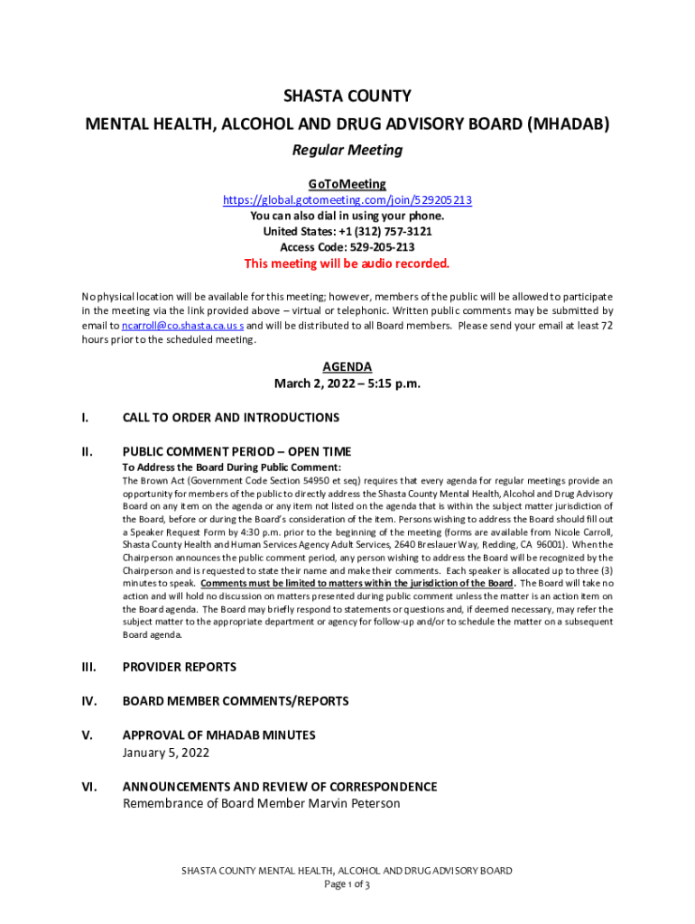 SHASTA COUNTY MENTAL HEALTH, ALCOHOL AND DRUG ADVISORY BOARD (McAdam) Regular Meeting GoToMeeting https://global.gotomeeting.com/join/529205213 You can also dial in using your phone. United States:
