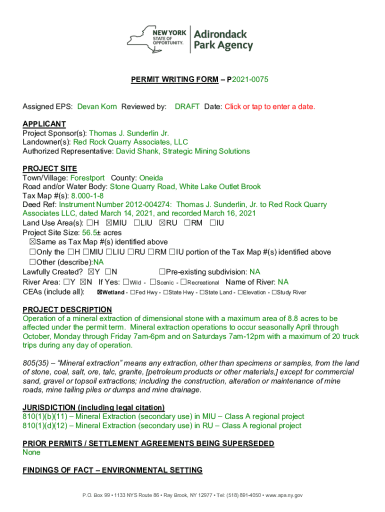 PERMIT WRITING FORM P20210075 Assigned EPS: Dean Born Reviewed by:DRAFT Date: Click or tap to enter a date. APPLICANT Project Sponsor(s): Thomas J. Underlie Jr. Landowner(s): Red Rock Quarry Associates,