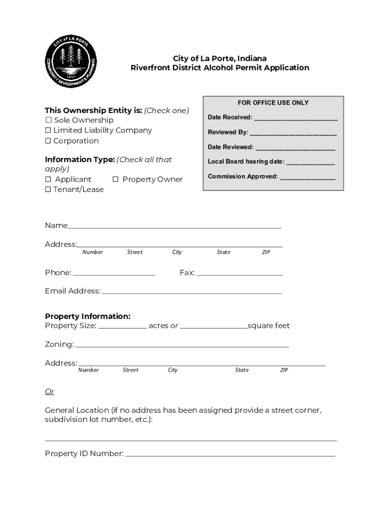 City of La Port, Indiana Riverfront District Alcohol Permit Applications Ownership Entity is: (Check one) Sole Ownership Limited Liability Company Corporation Information Type: (Check all that apply)
