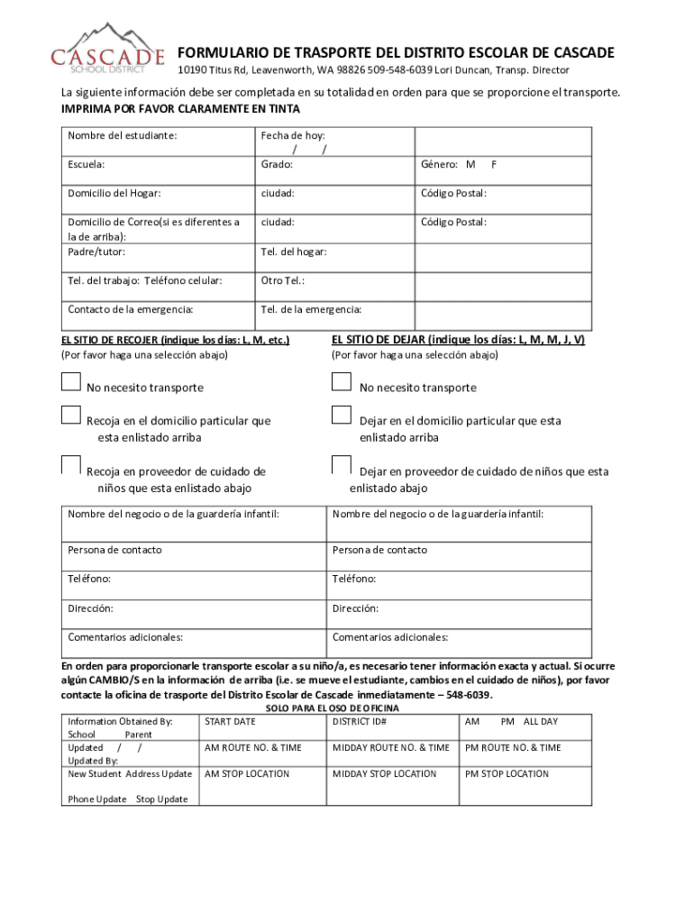 FORMULA RIO DE TRANSPORT DEL DISTRICT ESCOLAR DE CASCADE 10190 Titus Rd, Leavenworth, WA 98826 5095486039 Lori Duncan, Trans. Director La migraine information debt SER completed en SU totalized en
