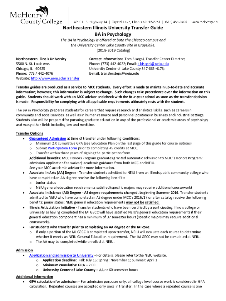 Northeastern Illinois University Transfer Guide BA in Psychology BA in Psychology is offered at both the Chicago campus and the University Center Lake County site in Grayslake. (20182019 Catalog)