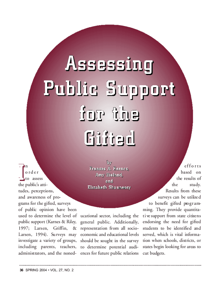 N order to assess the public attitudes, perceptions, and awareness of programs for the gifted, surveys of public opinion have been used to determine the level of public support (Barnes & Riley, 1997;