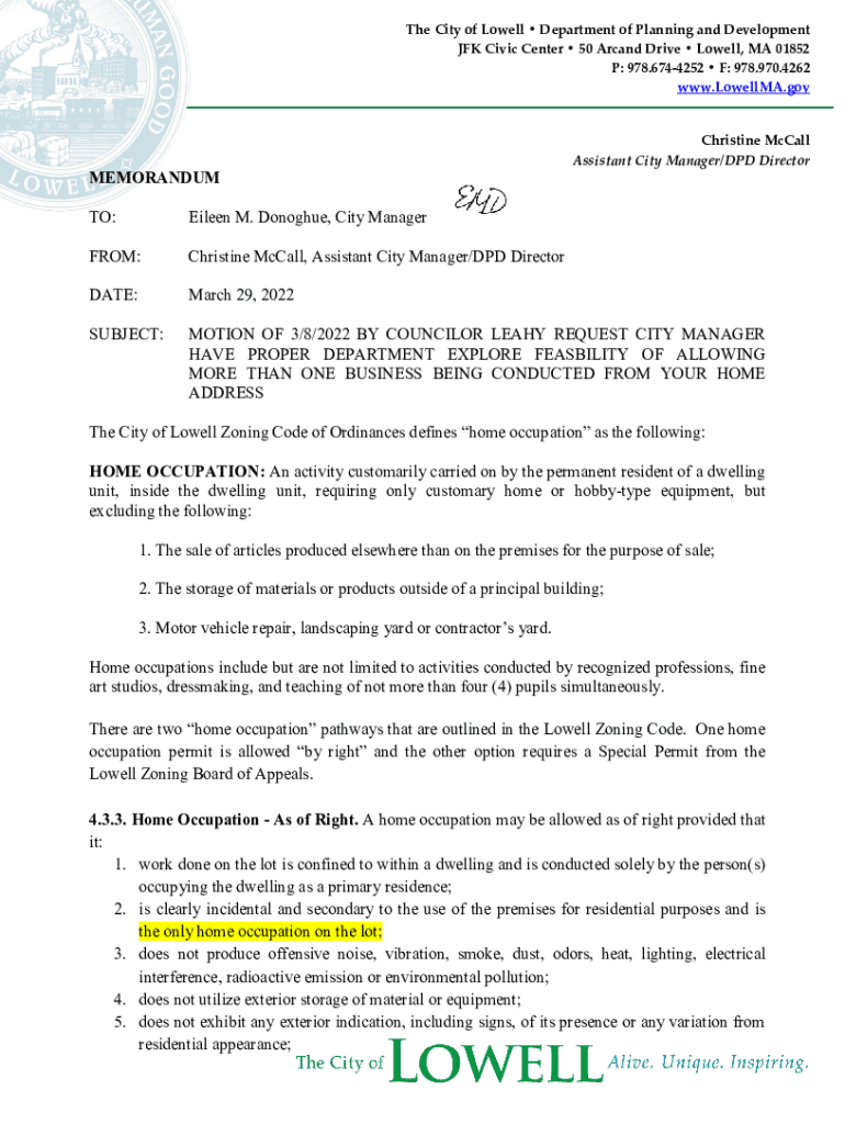 The City of Lowell Department of Planning and Development JFK Civic Center 50 Armand Drive Lowell, MA 01852 P: 978.6744252 F: 978.970.4262 www.LowellMA.govMEMORANDUMChristine McCall Assistant City
