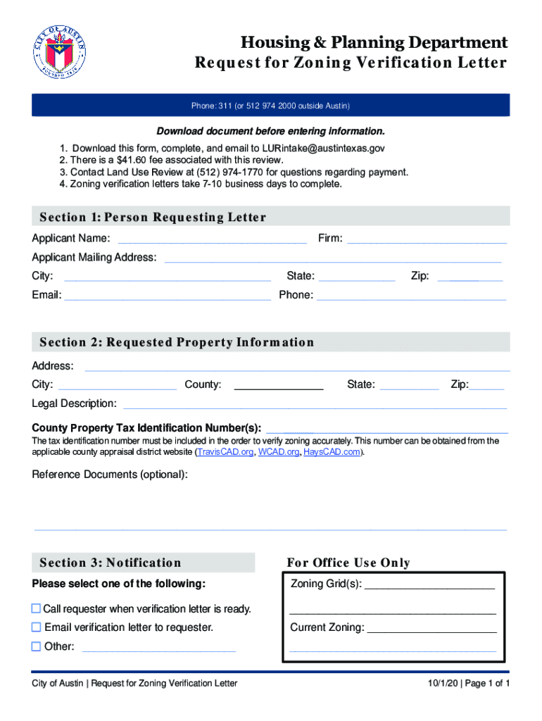 Housing & Planning Department Request for Zoning Verification Letter Phone: 311 (or 512 974 2000 outside Austin)Download document before entering information. 1. Download this form, complete, and