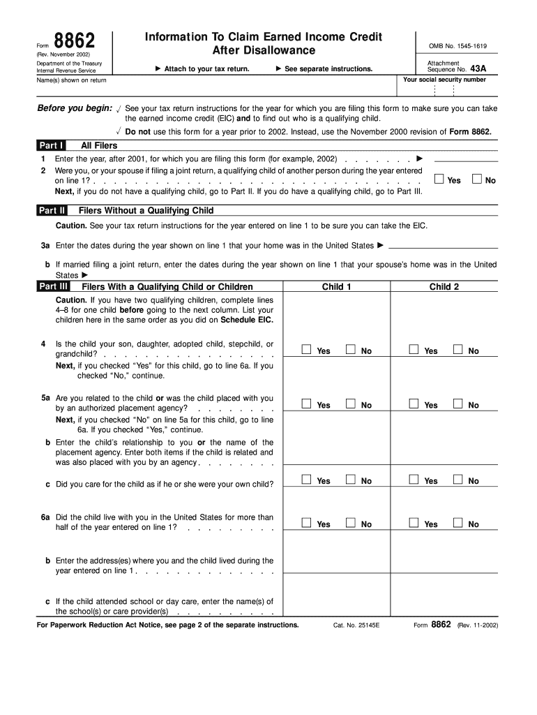 Form 8862 is a U.S. Internal Revenue Service (IRS) tax form specifically designed for individuals seeking to claim the Earned Income Credit (EIC). This form is particularly important for taxpayers whose previous claims for the EIC were disallowed. To effectively complete Form 8862, you must provide essential information, including qualifying children's details and residency status. Understanding how to properly utilize this form can significantly impact your eligibility for the Earned Income Credit.
