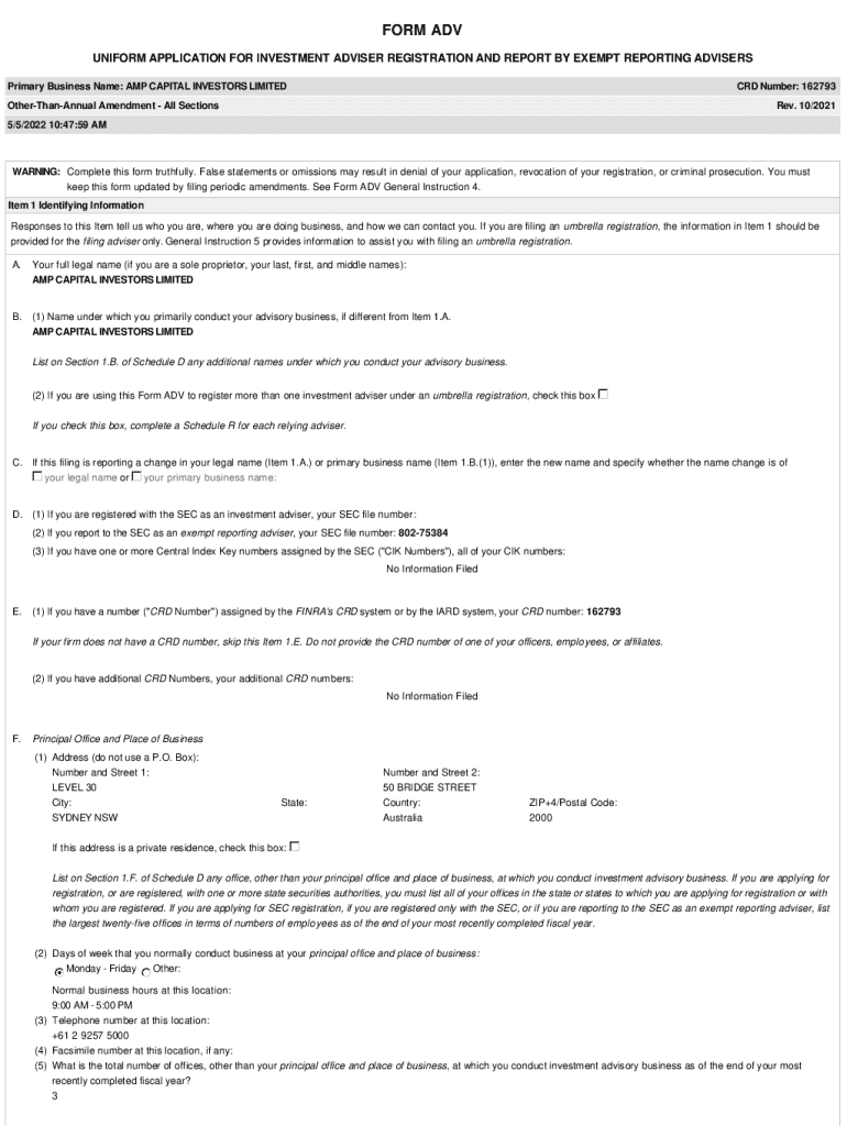 FORM ADV UNIFORM APPLICATION FOR INVESTMENT ADVISER REGISTRATION AND REPORT BY EXEMPT REPORTING ADVISERS Primary Business Name: AMP CAPITAL INVESTORS LIMITED CRD Number: 162793OtherThanAnnual Amendment