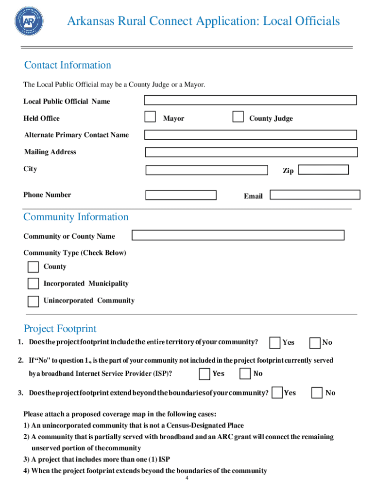 Arkansas Rural Connect Application1This is the application for the Arkansas Rural Connect (ARC) Broadband Grant Program. The ARC program application includes four (4) sections: 1. A section for local