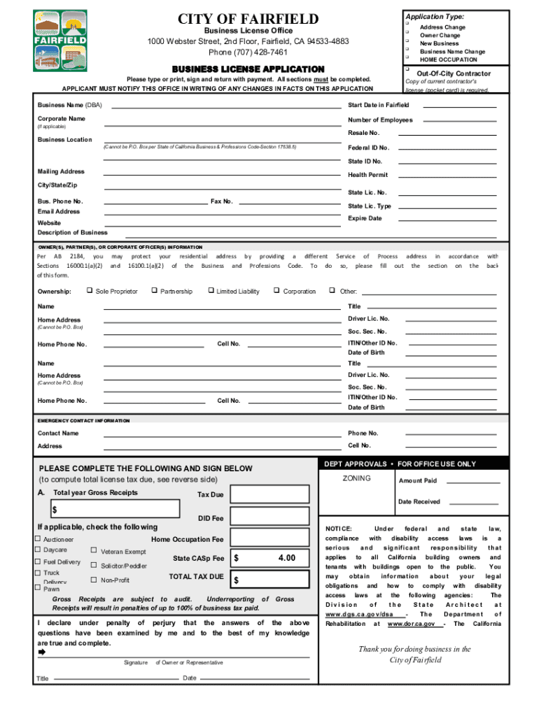 CITY OF FAIRFIELDApplication Type: Business License Office 1000 Webster Street, 2nd Floor, Fairfield, CA 945334883 Phone (707) 4287461Address Change Owner Change New Business Name Change HOME OCCUPATION