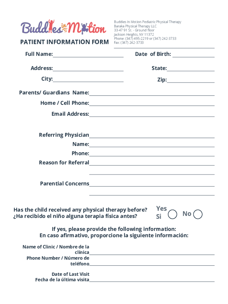 PATIENT INFORMATION FORM Full Name:Buddies In Motion Pediatric Physical Therapy Bar aka Physical Therapy LLC 3347 91 St. First floor Jackson Heights, NY 11372 Phone: (347) 4952219 or (347) 2423733