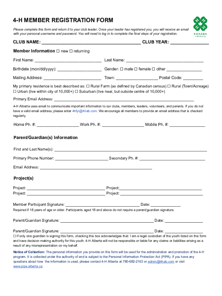 4HMEMBERREGISTRATIONFORM Pleasecompletethisformandreturnittoyourclubleader. Onceyourleaderhasregisteredyou, youwillreceiveanemail Withyourpersonalusernameandpassword. Youwillneedtologintocompletethefinalstepsofyourregistration