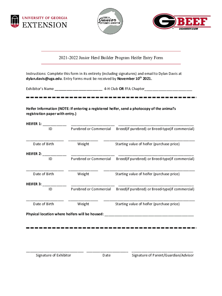 20212022 Junior Herd Builder Program Heifer Entry Form Instructions: Complete this form in its entirety (including signatures) and email to Dylan Davis at dylan.davis@uga.edu. Entry forms must be