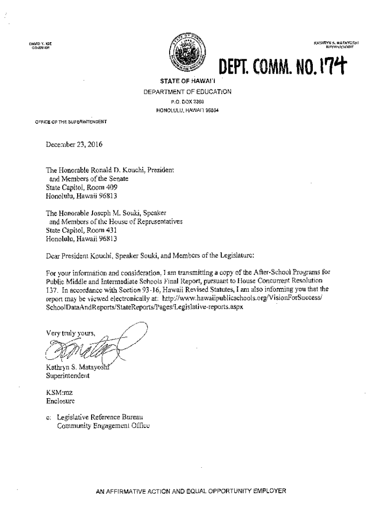 DAVID Y.KATHRYN S. MATAYOSHIIGESJPERINTENDNTGOMRNORDEPT. STATE OF HAWAII\'I DEPARTMENT OF EDUCATION P.O. BOX 2360 HONOLULU, HAWAII\'I 96804 OFFICE OF THE SUPERINTENDENT December 23, 2016, The Honorable