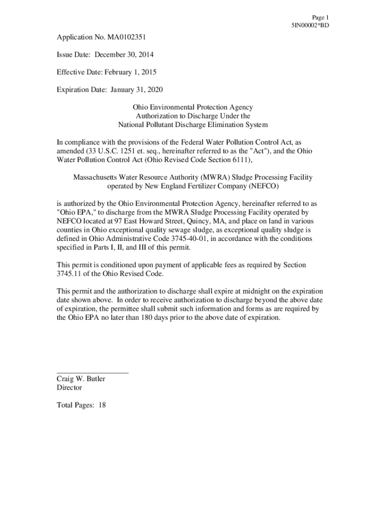 Page 1 5IN00002×Application No. MA0102351 Issue Date: December 30, 2014, Effective Date: February 1, 2015, Expiration Date: January 31, 2020, Ohio Environmental Protection Agency Authorization to