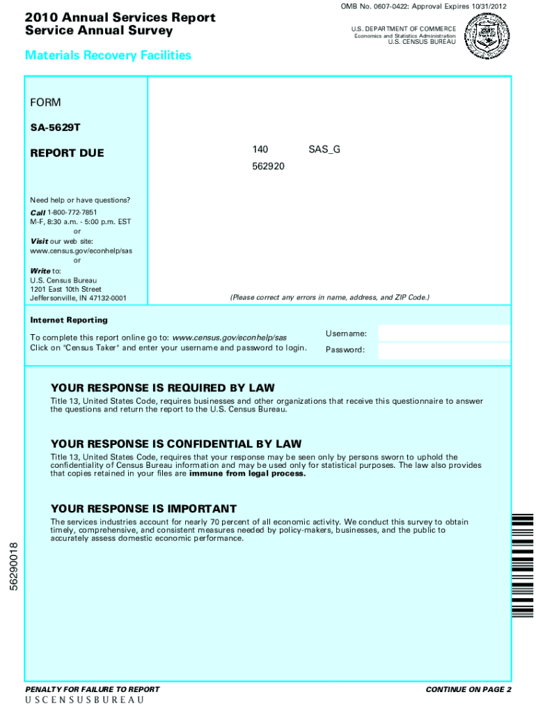 OMB No. 06070422: Approval Expires 10/31/20122010 Annual Services Report Service Annual Survey. S. DEPARTMENT OF COMMERCEEconomics and Statistics Administration. S. CENSUS BUREAUMaterials Recovery